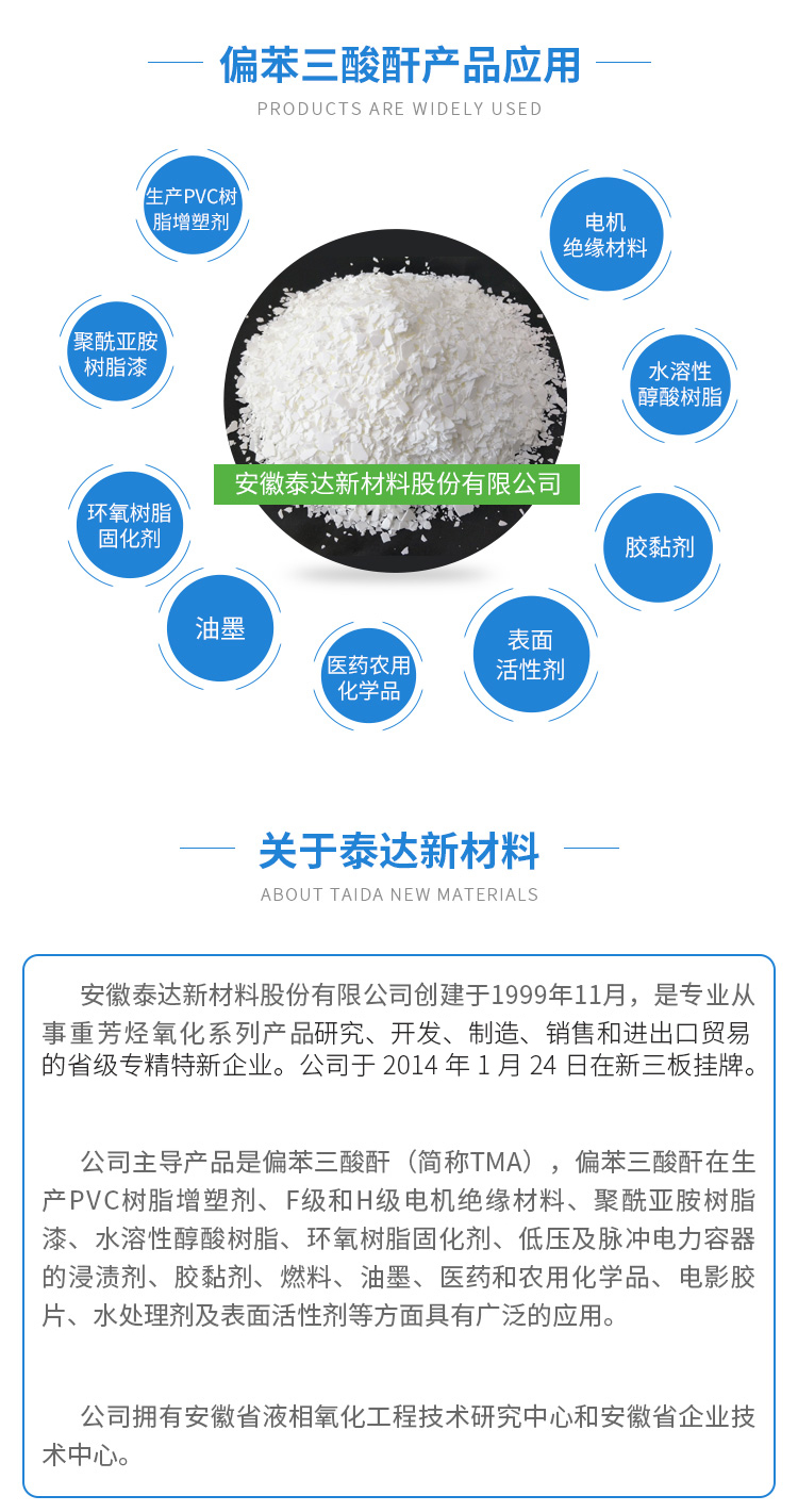 偏苯三酸酐即1,2,4—苯三甲酸酐,主要用于不飽和聚脂樹脂、聚酰亞胺樹脂、水溶性聚酯樹脂、水溶性聚氨酯樹脂、水溶性氨基醇酸樹脂、偏苯三酸三辛脂(TOTM)、環氧樹脂固化劑等產品,還可以用做高級航空潤滑油、電力電容器浸漬油、粒料粘結劑、施膠劑、消煙劑、瞬時粘結劑等。 |